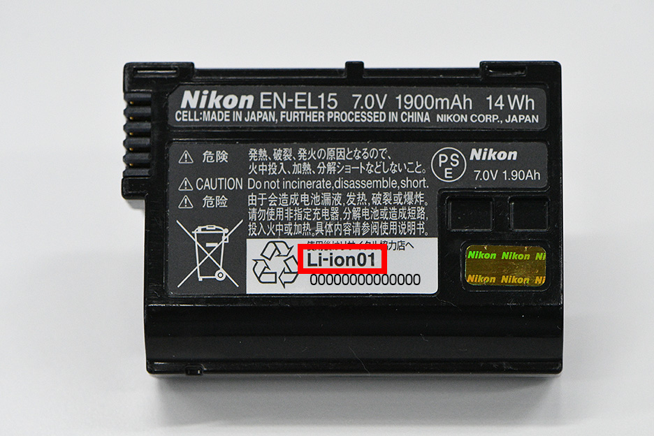 交換の対象となるLi-ionリチャージャブルバッテリーEN-EL15は、電池の裏面に貼付された銘版に“Li-ion01”と記載されています。この銘版に“Li-ion20”と記載されている電池はD500の付属品と同等ですので、交換の必要はございません。