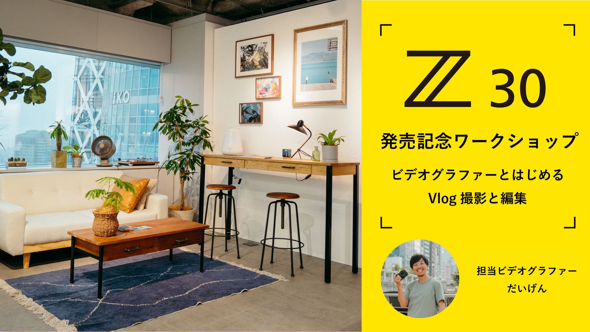 「Z 30発売記念ワークショップ」は、Z 30での動画撮影、Vlog制作を体験したい方のための少人数制の無料ワークショップです。参加者へは、Vlog撮影からこだわりの撮影まで、幅広いシーンでの動画や写真撮影に適した小型・軽量のミラーレスカメラ「Z 30」をお貸し出しし、撮影、編集といった動画制作の基本を、ビデオグラファーのだいげん氏から学ぶことができます。