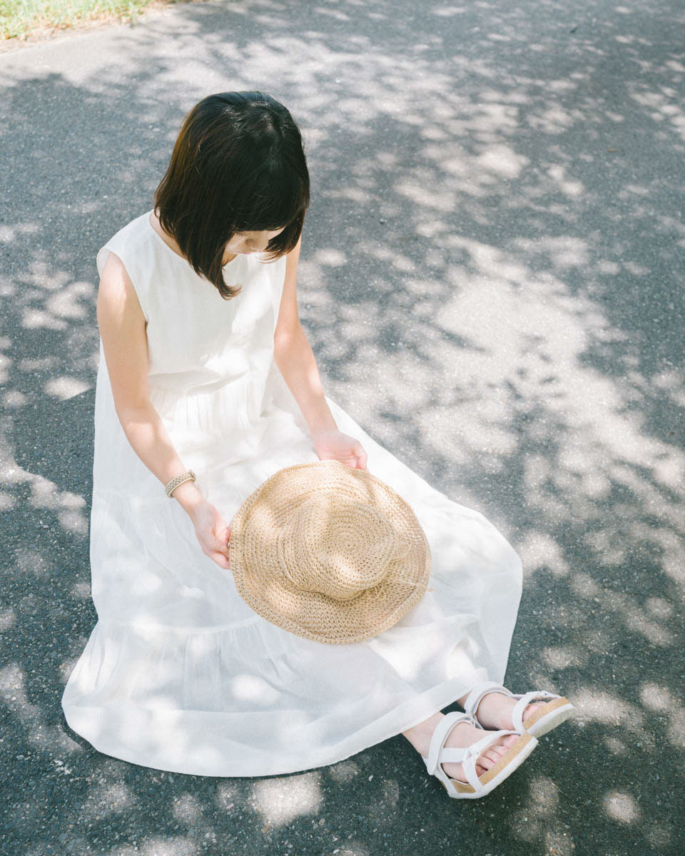 服や肌に木漏れ日模様ができて、写真に表情が出ます。繊細さやアンニュイさが演出できるので、木漏れ日の中での撮影はとてもオススメです。