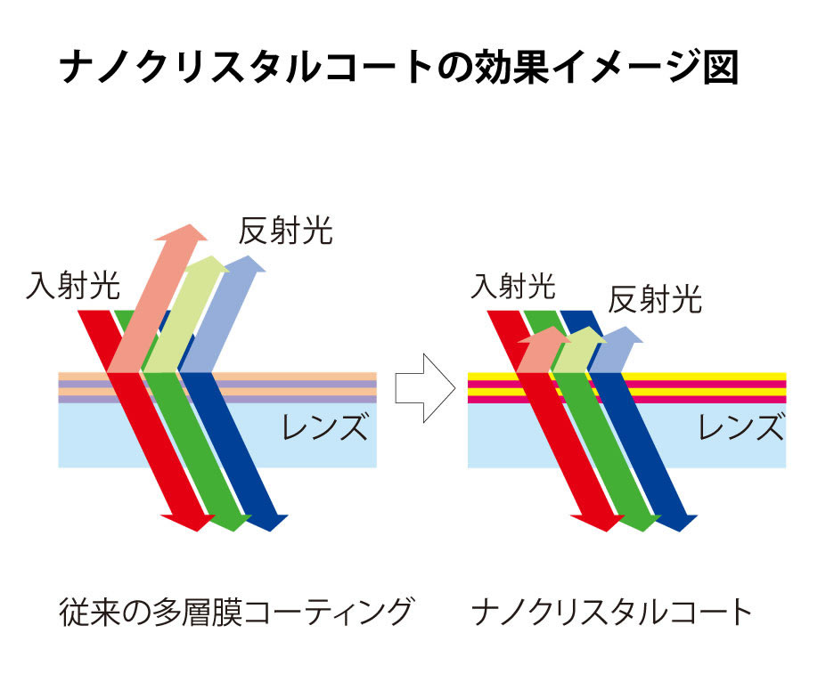 全可視光域にわたって、従来のコーティングレベルを超えた高い反射防止効果を実現するナノクリスタルコートを採用。逆光時のゴーストやフレアの発生を効果的に低減し、安定してクリアーな画像が得られます。