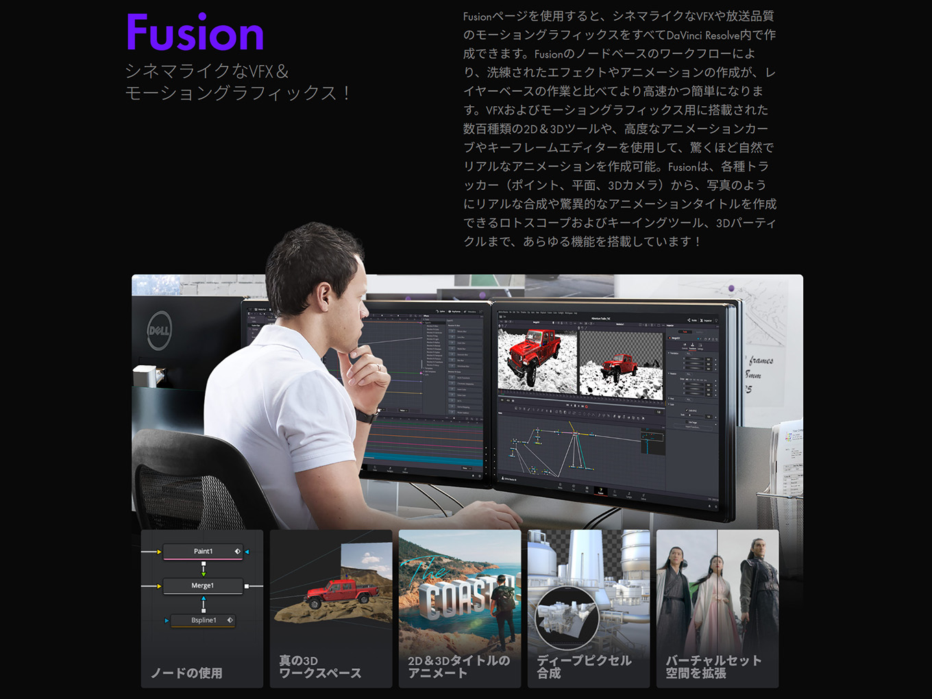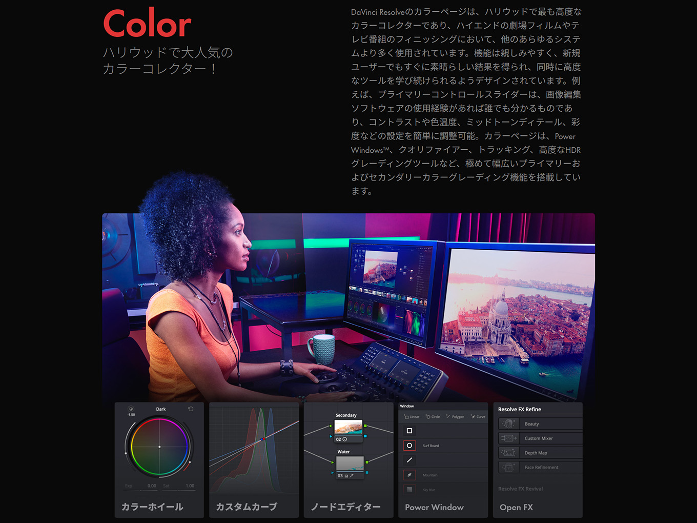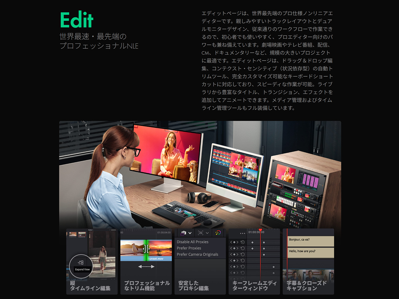 DaVinci Resolveは、編集、カラーコレクション、VFX、モーショングラフィックス、オーディオポストプロダクションをひとつのソフトウェアに融合した、世界唯一のソリューションです。エレガントで近代的なインターフェースは、初心者でも簡単で覚えやすく、プロユーザー向けのパワフルさも兼ね備えています。DaVinci Resolveを使用することで、複数のアプリケーションを習得したり、タスクごとにソフトウェアを切り替えたりする必要がないので、スピーディかつ高品質な作業が可能。これは、制作の全過程を通してカメラのオリジナル品質で作業できることを意味します。つまり、ひとつのアプリケーションで自分専用のポストプロダクションスタジオが手に入ります。そして何より、DaVinci Resolveを学ぶことで、ハリウッドのプロたちと全く同じツールを習得できます。