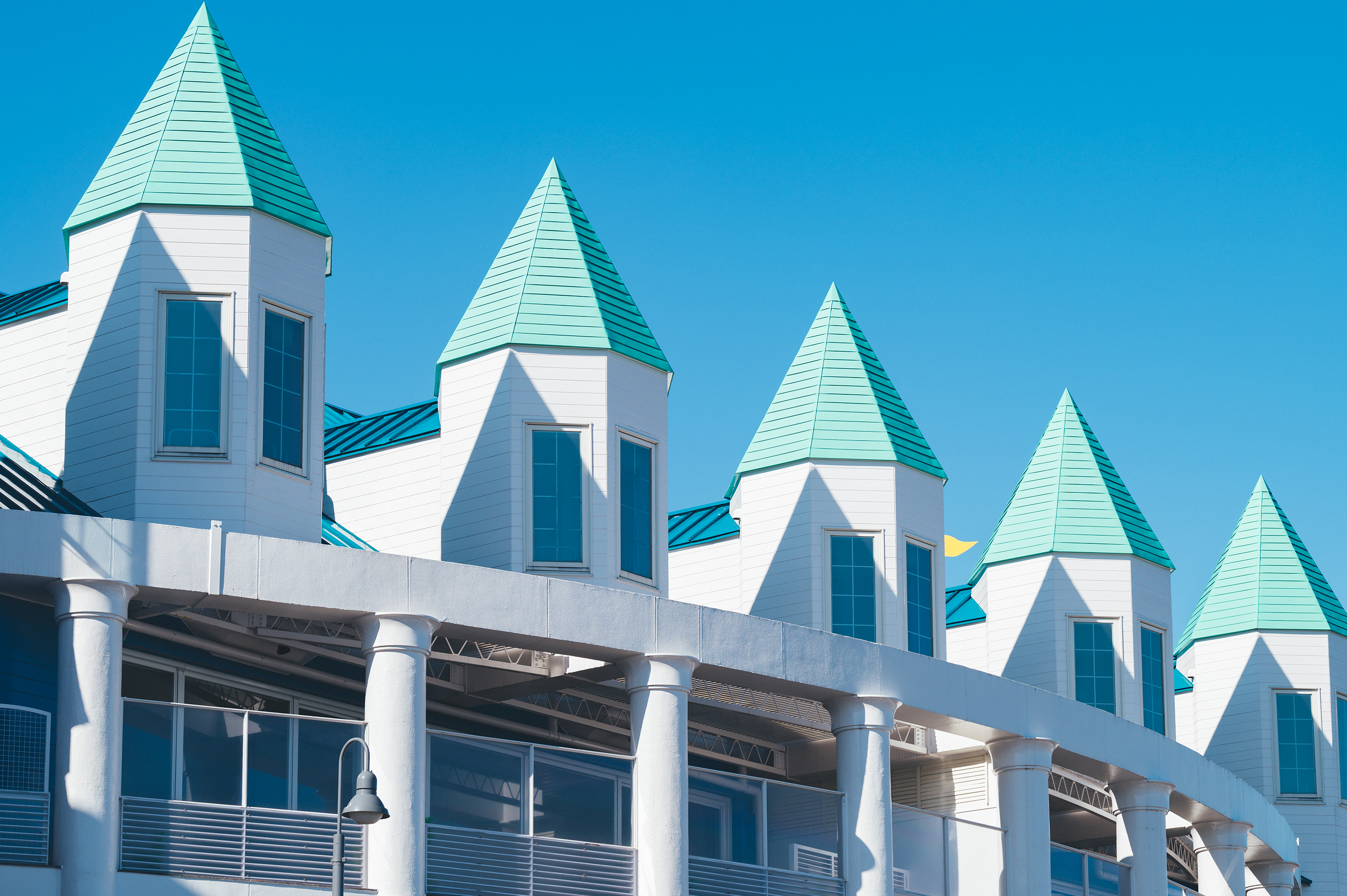 朝日を浴びて印象的に浮かび上がる、伊東の洋風建築を撮影。連なる屋根の形状をグラフィカルに見せたく、F6.3で奥行きを保ちながら構図を整えた。陰影の出方も狙い通りで、軽量なレンズのおかげで高い位置からの撮影も無理なく行えた。