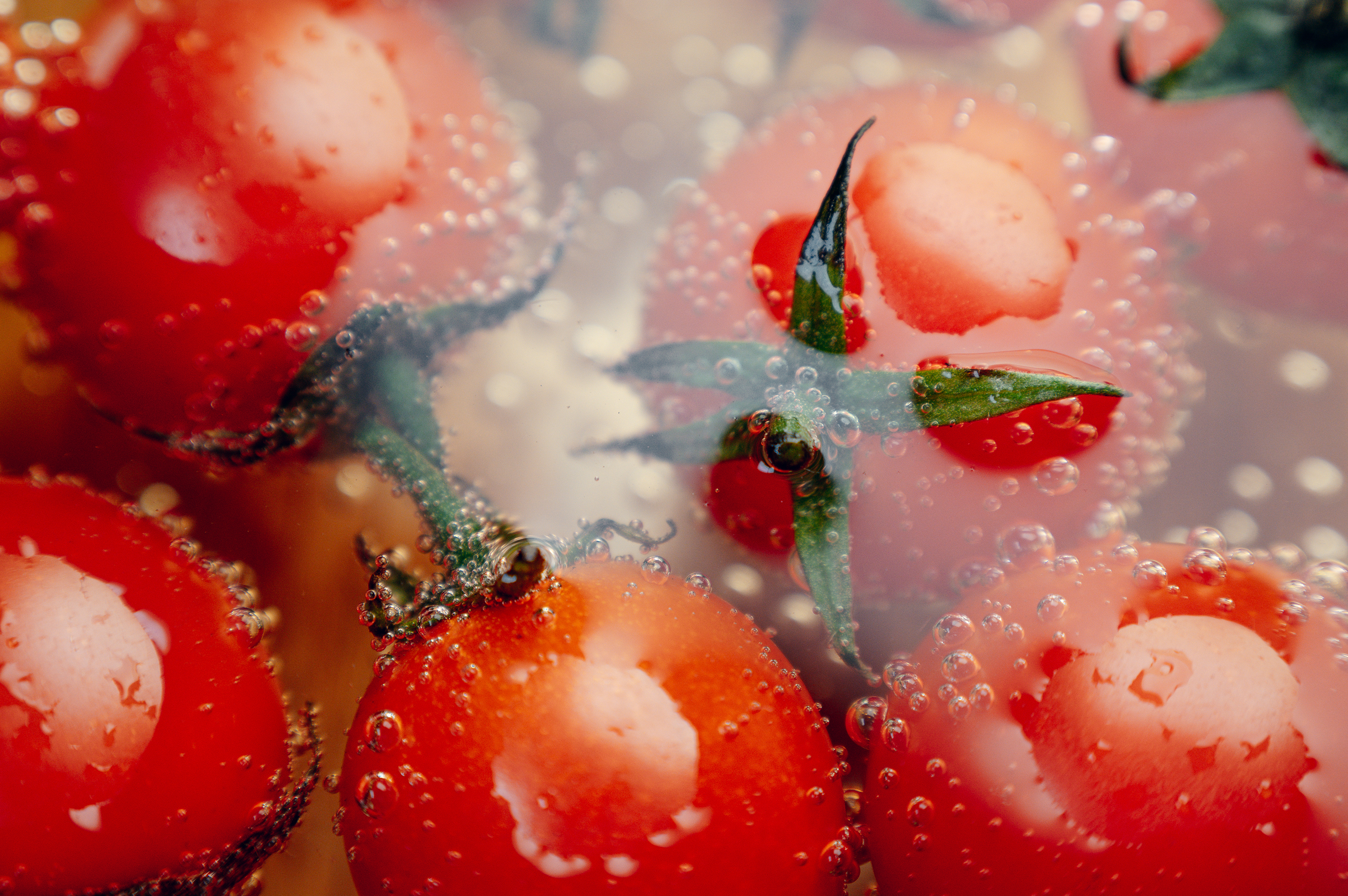 スーパーに並んだプチトマトがかわいく思えて、家に持ち帰って撮影。薄く色のついたガラスボウルにただ水を貼って浮かべても面白みに欠けるので、炭酸水を張ることでプチトマトにまとわりつく気泡を作り出した。105mmのクローズアップ撮影はヘタや気泡をしっかりと写し出してくれ、なにより気軽にこうした撮影を試せるのが楽しい。