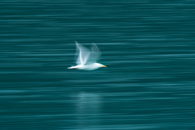 氷河を見に行くクルーズ船に乗って海を航行していたら、カモメがすぐ脇を同じ速度で飛んでいるのが見えた。とても気持ちよさそうに、凪いだ海面すれすれの高さを滑るように羽ばたいていた。これまではカモメを見て、遊んでいるように見えることなどなかったが、船と伴走して低空飛行している姿は、どう見ても海面すれすれの滑空を楽しんでいるようにしか思えなかった。空を飛ぶカモメの爽快さを、羽ばたきのスピード感で表現してみた。