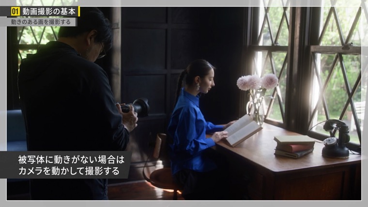 手元から頭までゆっくりカメラを動かしたり、わざとピントを外した状態からゆっくり合わせてみたり、様々な方法があります。カメラで動きをつける時も、のりしろを意識してすぐにカメラを動かすのではなく、最低でも5秒程度動き出しと動き終わりの画を映してから動かしましょう。