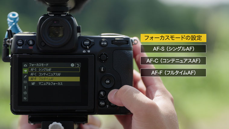 まずは、フォーカスモードの設定についてです。動画撮影時、フォーカスモードは、AF-S、AF-C、 AF-Fの3種類から選択できます。