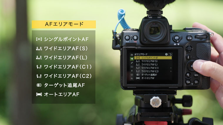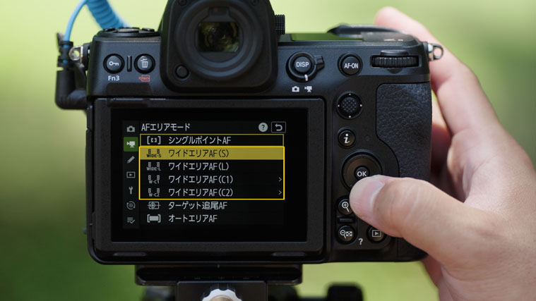AFエリアモードは、ワイドエリアAF (S)、ワイドエリアAF (L)、ワイドエリアAF(C1)、ワイドエリアAF(C2) の4つがおすすめです。サブセレクターでAFエリアを移動させ、好きなタイミングでAF-ONボタンを押すことでもフォーカス送りができます。