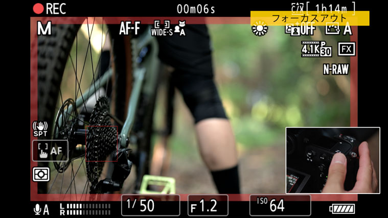 フォーカスインをする場合、最初にピントがボケているアウトフォーカスの状態でAF-Lを割り当てたカスタムボタンを押してピント位置を固定します。被写体にピントを合わせたいタイミングでボタンを放すと、徐々にフォーカスインしていきます。
