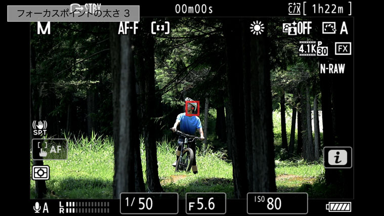 カスタムメニューa11 の[フォーカスポイント表示]の[フォーカスポイントの太さ]から三段階で変更できます。背景がうるさいシーンなどでフォーカスポイントを見やすい太さに調整できるので便利です。