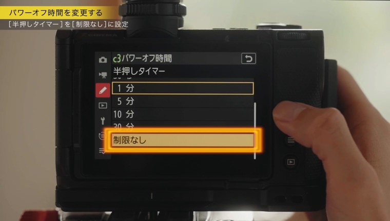 ZRの初期設定では、省電力のため、スタンバイ中に自動で電源がOFFになる設定になっています。これを解除するには、カスタムメニュー[c3:パワーオフ時間]の[半押しタイマー]の時間を[制限なし]にします。