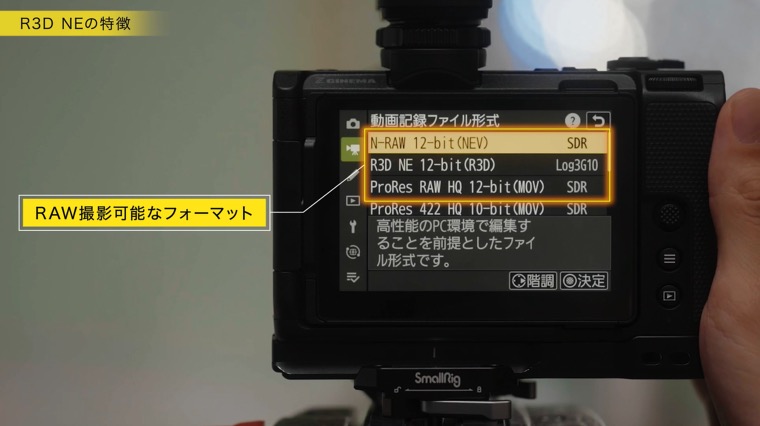 ZRのRAW動画には、N-RAW、R3D NE、ProRes RAW という3種類の記録フォーマットがあります。N-RAWとProRes RAWは、階調モードが[N-Log]または[SDR]となります。R3D NEはREDのシネマカメラと同じLog3G10/REDWideGamutRGBの階調になる、という違いがあります。