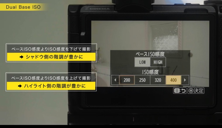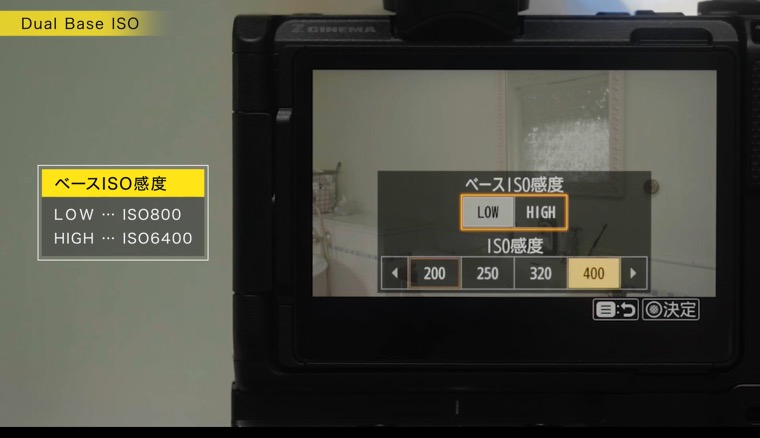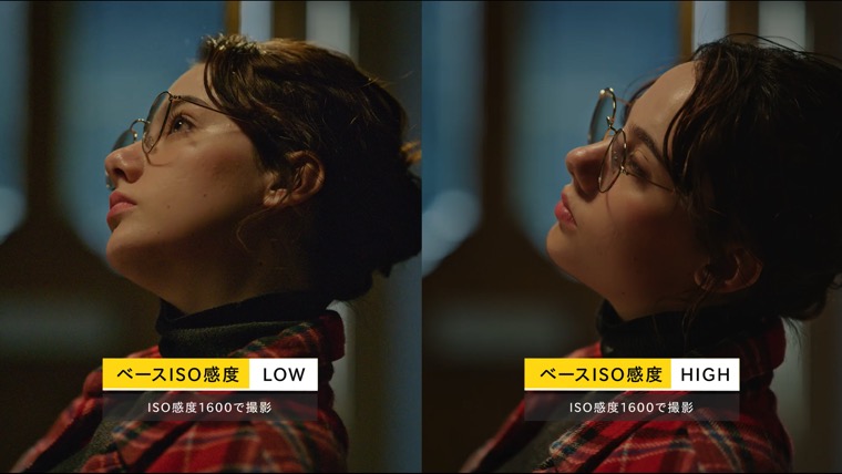 ベースISO感度の[低感度]はISO 800、[高感度]はISO 6400を意味するもので、ISO感度の数値はそれぞれのベースISO感度から前後2ストップの範囲で変えられる仕様になっています。