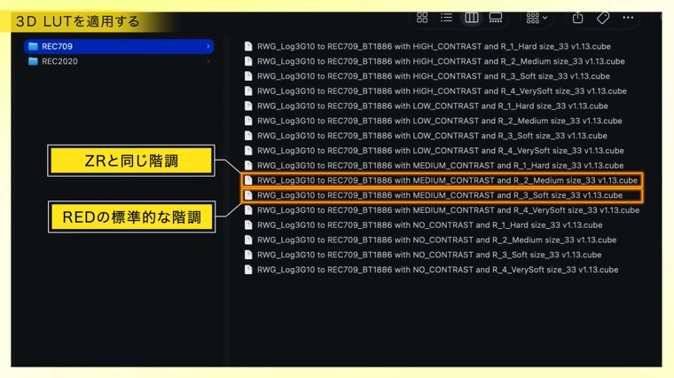 ZRの内蔵LUTと合わせたい場合は、ファイル名に MEDIUM CONTRAST、R_2_Mediumとあるものを、REDの標準的な階調にしたい場合は、ファイル名に MEDIUM CONTRAST、R_3_Soft とあるものを選択します。