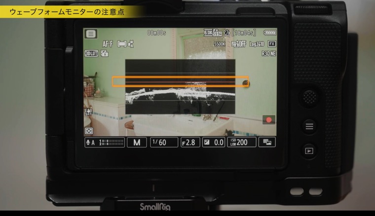 R3D NE 撮影でウェーブフォームモニターを使用する場合は、ハイライトのクリップ位置が変わるため、表示される警告線を参考にして露出を確認します。