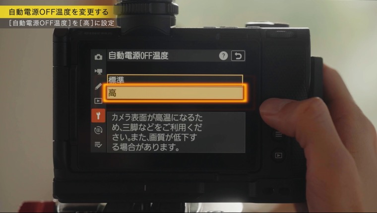 また、セットアップメニュー[自動電源OFF温度]の設定を[高]にすることで、長時間撮影や炎天下の撮影で、カメラの自動シャットダウンが起こりにくくなります。