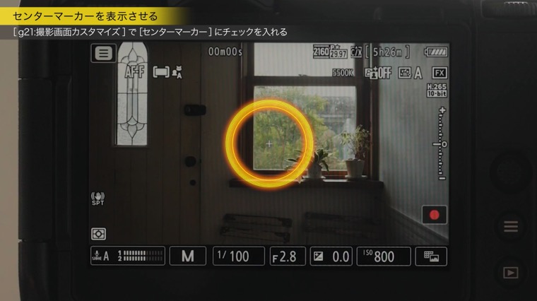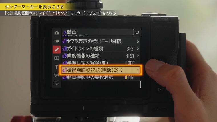 画面にセンターマーカーを表示したい場合は、[g21: 撮影画面カスタマイズ]で設定ができます。