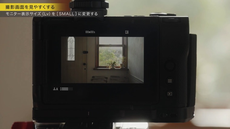 イメージに撮影情報が被るのを避けたい場合は、セットアップメニューのモニター表示サイズ(Lv)を[小さめ]に設定した上で撮影画面を切り替えます。