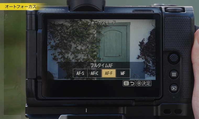 フォーカスモードには、4種類のモードがあります。そのうちAF-Fは、自動で被写体を追い続け、フォーカスを合わせ続けるモードです。ジンバル撮影など、手動でのフォーカス操作の難しい場面で有効に使えます。