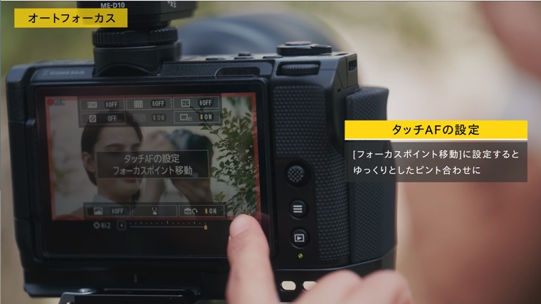 AF-Fでは、オートエリアAFとの組み合わせで、タッチAFでもピント合わせができます。タッチAFは「フォーカスポイント移動」に変更すると、ゆっくりとしたピント合わせ※になり、映像表現に適しています。